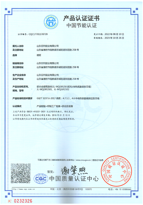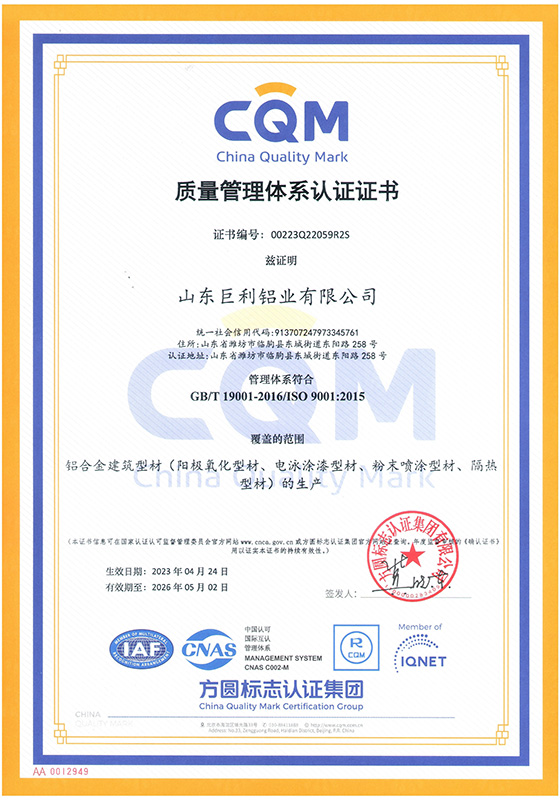 山東巨利鋁業(yè)有限公司是大型專業(yè)化鋁合金門(mén)窗、幕墻建筑型材生產(chǎn)企業(yè)。公司座落于中國(guó)江北最大鋁合金建筑型材生產(chǎn)、銷售集散地,被稱為“中國(guó)鋁業(yè)之都”的臨朐,地處山東半島中部,濰坊市西南部,沂山北麓,公司西臨彌河,東靠長(zhǎng)深高速,北接濟(jì)青高速,地理位置優(yōu)越,交通十分便利。公司占地總面積18.5萬(wàn)平方米,擁有國(guó)際先進(jìn)水平的擠壓、陽(yáng)極氧化、電泳涂漆、粉末噴涂、氟碳噴涂、木紋轉(zhuǎn)印、隔熱斷橋等系列生產(chǎn)線,年生產(chǎn)節(jié)能環(huán)保鋁型材7萬(wàn)噸。公司先后通過(guò)IS09001質(zhì)量管理體系認(rèn)證、ISO14001環(huán)境管理體系認(rèn)證、0HSAS45001職業(yè)健康安全管理體系認(rèn)證、IATF16949汽車(chē)行業(yè)質(zhì)量管理體系認(rèn)證和中國(guó)綠色建材產(chǎn)品認(rèn)證。公司先后榮獲山東省專精特新中小企業(yè)、山東省高新技術(shù)企業(yè)、山東省科技型中小企業(yè)榮譽(yù)稱號(hào)。“客戶的滿意,巨利的追求”。不斷的改進(jìn)和完善質(zhì)量管理,不斷的提高售后服務(wù)水平,持續(xù)向客戶提供一流的產(chǎn)品和一流的服務(wù),是我們巨利人孜孜以求的永恒目標(biāo),我們?cè)概c廣大業(yè)務(wù)同仁共同努力,共創(chuàng)雙贏,不斷發(fā)展,走向更加輝煌的明天。
